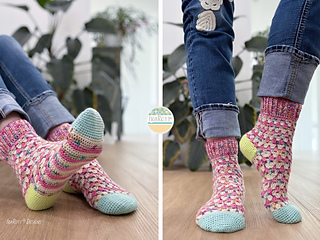Fall in love with the coziest crochet socks you’ll never want to take off! The Granny Remix Socks bring a fresh twist to the classic granny stitch. Worked toe-up with a smooth, durable single-crochet sole that’s made to last. With a nearly seamless construction, they feel incredibly comfortable and fit like a dream. The pattern includes 8 sizes (from toddler to XL adult), so you can make a cozy pair for yourself, or create matching socks for the whole family.