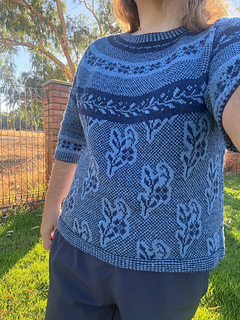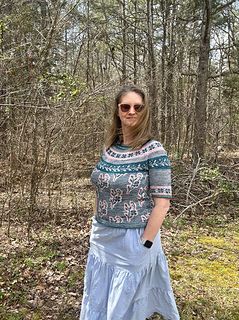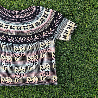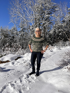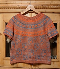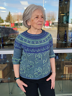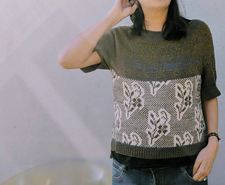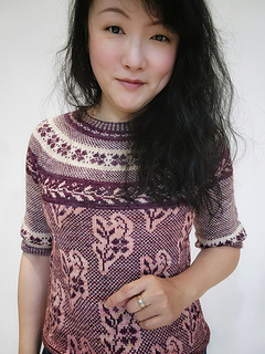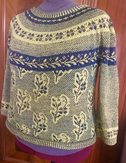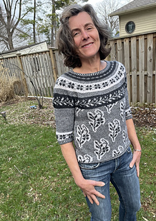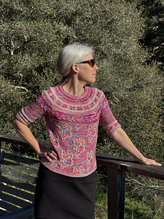 It’s a top-down circular yoke, worked in the round. The short row shaping for the upper back is distributed throughout the yoke depth, and incorporated into each of the single-color sections in the upper body. After the sleeve and body stitches are divided, the lower body is worked down to the hem and the sleeves are worked to the cuffs.