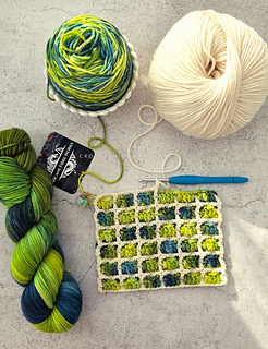 Contrast color (rectangular blocks on the RS): Arcane Fibre Works 80/20 Super Wash DK (80% Extra Fine Merino, 20% Nylon; 218 yds/200 m per 3.5 oz/100 g hank) in color Wandering Through the Woods