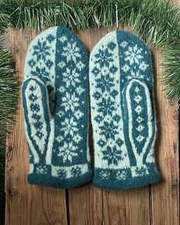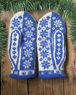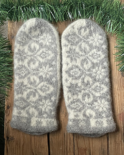 Det här mönstret innehåller 60 maskor. Vantarna är tovade i maskin. Mönstret är på svenska och engelska.