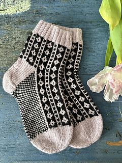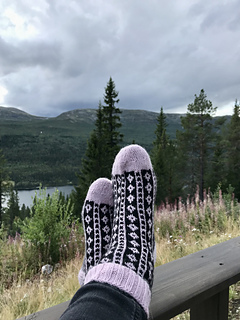 Disse sokkene er inspirert av et par strømper, trolig strikket av Elida Sæverudmoen fra Nes under siste krig. Det langstripete mønsteret dekker kun leggene på de gamle strømpene, men jeg har latt det følge hele oversiden av foten.