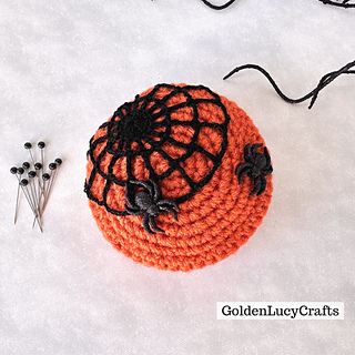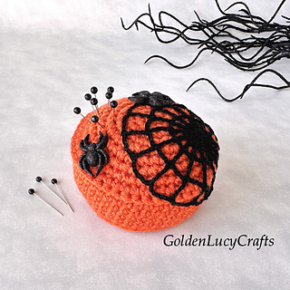 This crochet pattern is for a Halloween pincushion. Pincushion is embellished with a spiderweb and two spider craft buttons.