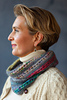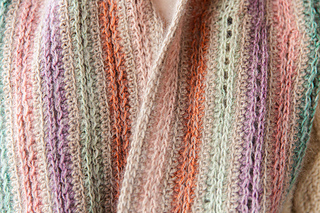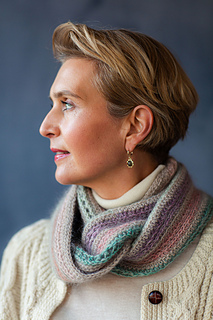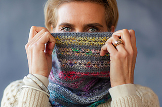 with mohair throughout the cowl, taming even the wildest colours into a beautiful palette. Two strands are held double throughout the project, one of the yarn A (Drops Kid Silk) and one of yarns B–N for short cowl, and B–H for long cowl.