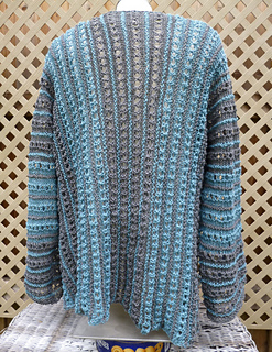 Size is adjustable by increasing or decreasing the sleeve length or body width, by adding or reducing a pattern set (10 rows). The body length can be adjusted by adding or reducing the number of stitches by multiples 2 on each the back and front.
