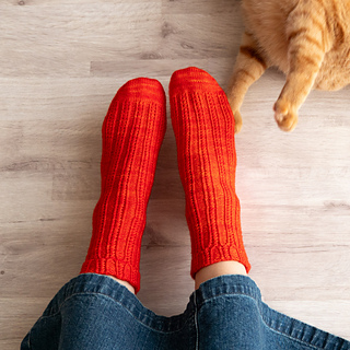 Hanano(花野)は、秋の草花が咲く野原をイメージしたカフダウンソックス。小さなケーブルとねじり目を組み合わせたリブ模様が特徴です。二重仕立てのカフは足首を締めつけにくく、すっきりとした仕上がりになります。模様編みはシンプルな技法のみで構成されており、覚えやすいのもポイントです。かかとはヒールフラップ、ヒールターン、ガセットタイプ。カフ、レッグ、インステップ(足の甲)に模様編みを編みます。模様編みはチャート(編み図)と文章パターンをそれぞれ収録。動画解説リンク付きです。