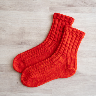Hanano means “A field full of autumn flowers and grasses” in Japanese. These cuff-down socks by Yucca feature ribbing composed of small cables and twisted stitches. The folded cuff does not constrict the ankle, and the edges look clean. The stitch patterns are easy to remember with only simple techniques.