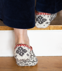 If you are new to colorwork, these slippers are a great place to start. You can learn all about knitting and purling in colorwork, chart reading, a Latvian braid. It’s colorwork in a nutshell. Two skeins (grey and white) of Rauma Strikkegarn makes 3 single slippers. You will use only 6 yards of the accent color.