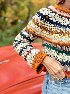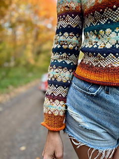 The Happy Camp Sweater is a seamless, top-down design that balances bold all-over colorwork with easy wearability. A ribbed collar and short-row shaping set up the yoke, where geometric motifs unfold in rhythmic repeats across the body and sleeves. Simple rounds in the main color give the eye (and the knitter) space to breathe.