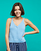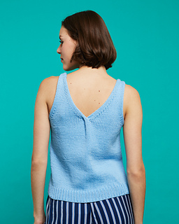 Das Top wird bis zu den Armausschnitten von unten nach oben zunächst in Runden gestrickt, danach werden VT und RT in Hin- und Rückreihen getrennt gearbeitet. Besondere Designmerkmale sind die betonten Abnahmen, die leicht eingeroll- ten Ausschnittkanten, die Verzopfungen am unteren Rand des vorderen und hinteren Ausschnitts und die Drehungen an den vorderen Trägern. Die Trägermaschen werden mit der 3-Nadel- Methode oder alternativ im Maschenstich verbunden.