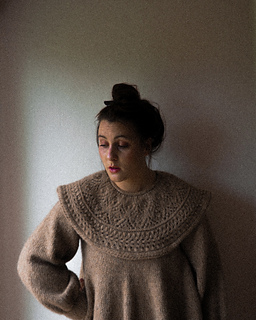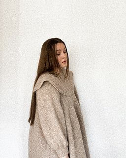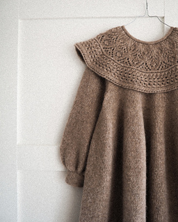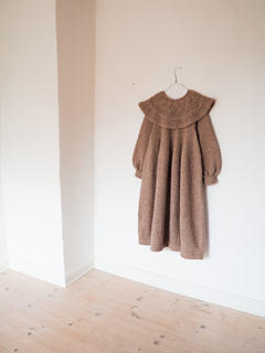 Method: This dress is worked top-down in the round in Stockinette Stitch, with a circular yoke whose increases continue down along the body, to form the flare of the skirt. To create the puffed sleeves, increases are worked gradually towards the cuffs, which are then finished with a folded edge. To finish the dress, an I-cord edge and a wide lace collar are worked along the neckline.