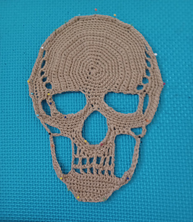 A crocheted skull that can be appliqued to clothing or crocheted together into a shawl.