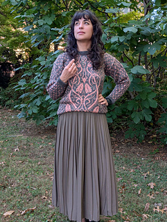 Hedgebind is inspired by botanical themes and delicate tendrils of Art Nouveau book covers, especially those by Margaret Armstrong. The classic drop-shoulder silhouette allows the intricate colourwork panel on the front to take center stage.