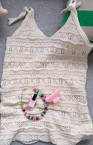 Beautiful and elegant dress in structured knit. Summer dress knit in Cuddle me cotton - can be knitted for older children and women. The dress is knitted from the bottom up with a structured pattern. When the dress has the desired length, bind off at the sides and divide the work into 4. 4 triangles are knitted, each ending with straps. The straps are made with knots so that you can adjust the length and fit yourself. The dress is equally suitable for wearing alone or over a lace shirt or t-shirt.