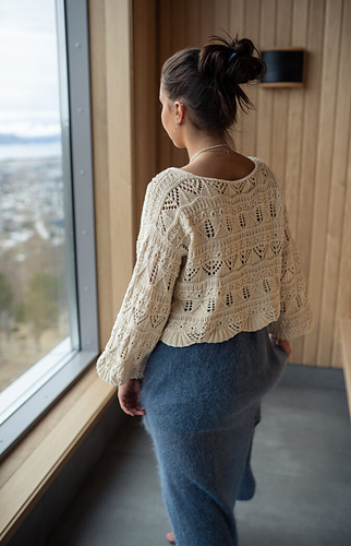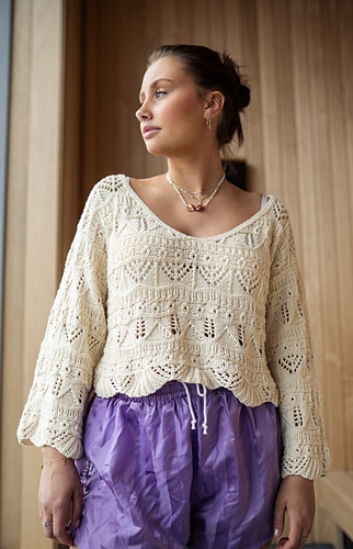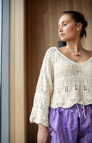 Elegant and beautiful sweater in cotton. Knit from the bottom up with a beautiful structured pattern. First, the body is knitted in the round. Then, the armholes are cast off and the back piece is knitted back and forth. Then the front piece is knitted back and forth for a bit before being divided into two front pieces, which are finished one after the other with decreases and increases to form the neckline. The front and back pieces are sewn together over the shoulder. The sleeves are knitted in the round from the bottom up and then assembled into the sleeve openings.