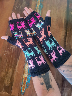 These fingerless mitts are knit from the bottom cuff upwards and finish before the end of the fingers. They have a repeating cat motif running throughout the mitt. They are knit seamlessly in the round. Stitches are picked up to create a simple open-ended thumb.