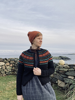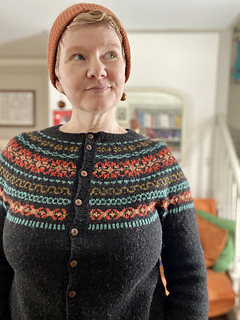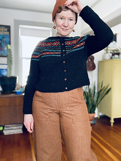 This cardigan is worked in one piece from the top down with a circular yoke construction and steek stitches down the center front. Short rows are used to raise the back neck and optional short rows are included again after the colorwork raising the lower half of yoke. Sleeves and body are separated at the underarm, then worked individually down to cuff and hem. Body includes optional A-line waist shaping. The neckline, hem, cuffs and buttonbands are worked in 1x1 rib. Body and sleeve lengths may be adjusted (note that adjustments in length will affect total yardage