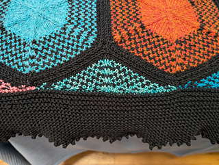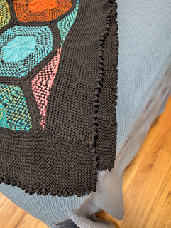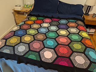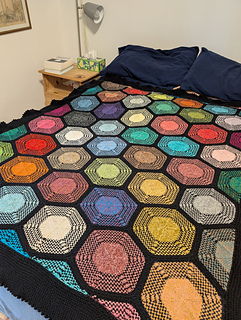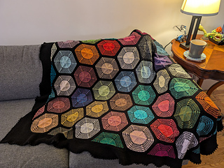 This blanket uses the main color for the linen-stitch increase rows and black contrast color for the bind-off of each component and the border. It was designed to use almost every gram of 49 colors in the Scheepjes Stone Washed/River Washed Color Pack; with each hexagon taking almost a full 10-gram mini-skein.