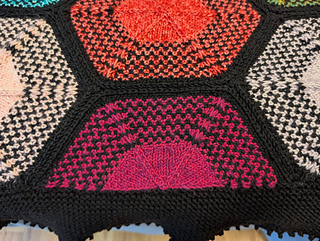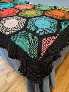 Did you know that hexagons can be infinitely tiled to fill a space, with no gaps? Hextangled – a portmanteau of “hexagon” and “rectangle” – is a blanket made of three types of modular components: hexagons, half-hexagons and hexagon-edges, that combine to form an almost-perfect rectangle. The components have solid stockinette centers, and a linen-stitch outer ring; using two colors, the linen stitch makes bold zig-zags that are the perfect canvas to play with color. A garter stitch-border, with two short-row triangles in opposite corners to fully square the components, is picked up and knit along each edge, and then is finished with a picot bind-off.