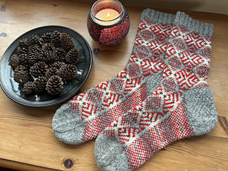 The length of the leg can be varied between two or three pattern repeats. The socks in picture have three and yarn quantities are for longer legged socks. The foot length is adjusted to recipient’s foot.