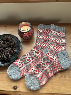 I adore the luxury of handmade socks on my feet particularly on a cold winter’s night at home here in Shetland. Inspiration for these came at Shetland Wool Week 2024 during a class I was pair teaching at when I was explaining how a Fair Isle chart can be put into a variety of garments, accessories or even household items.