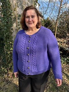 cable detail running down the fronts and sleeves. Knit seamlessly from the top down and it includes optional bust darts for a more customized fit. The pattern is written for ten sizes, with a finished bust measurement ranging from 73.5–164 cm / 29–64.5 inches.