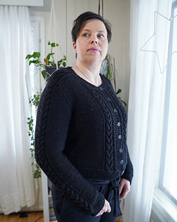 This cardigan is recommended to be worn with positive ease of 2.5–10 cm / 1–4 inches. If you enjoy an oversized cardigan, nothing stops you from choosing a size with more than the