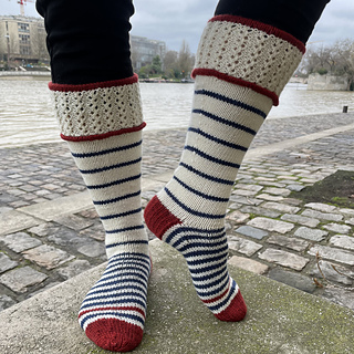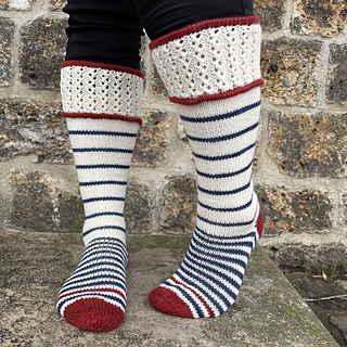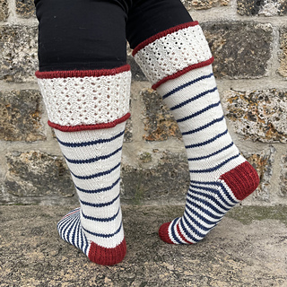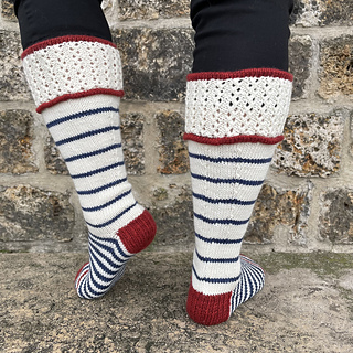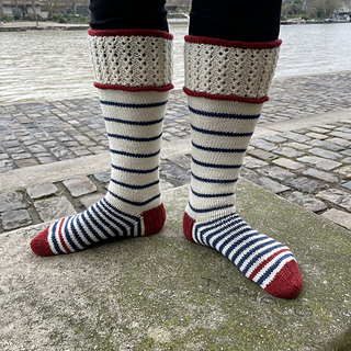 Hiiulihei socks are worked top down and they have a reinforced heel. Two welts keep the leg in shape and a lacey ribbing gives space to the calf. Mariniere stripes decorate the long legs which fit tightly on your legs. Heel turn is worked in a contrasting colour. For a bit of maritime fun, the striping sequence changes on the feet – you can play with the stripes if you like! The toe has a radiate decrease which gives it a nice round shape.