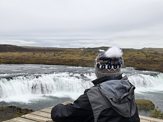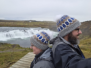 Hlýtt means “warm” in old Icelandic. My husband and I took a vacation to Iceland in September of this year, and I designed this hat to celebrate that vacation. Inspired by Icelandic lopapeysa sweaters, and using true Icelandic yarn, I wanted to knit a pair of hats that would keep us warm in the chilly climate. I finished them in time to take with us, so you’ll see some photos of us wearing them in front of waterfalls we saw while in Iceland.