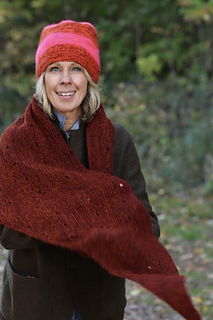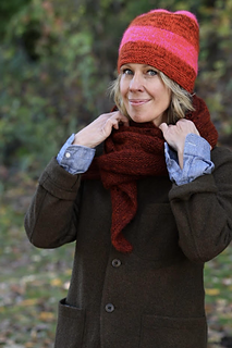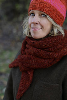 16 sts and 20 rows = 4” / 10 cm in eyelet pattern with yarns held together, blocked