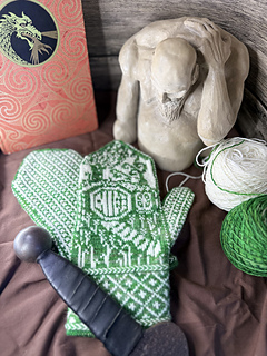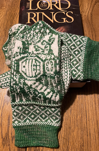 When I was a kid my parents bought a recording of The Hobbit by J.R.R. Tolkien, read by Nicol Williams. I can’t count how many times I have listened to that version. These mittens are an homage to the comfort and idyll of the shire. A warm hearth, a well-worn stone path to the welcoming front door, and flowers in the garden.