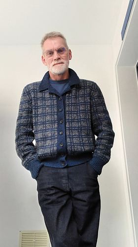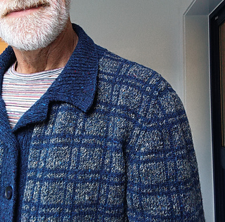 Sweater with plaid/checked pattern and contrast ribs and collar. The horizontal stripe is knitted and the vertical stripe is crocheted after the body has been knitted.