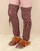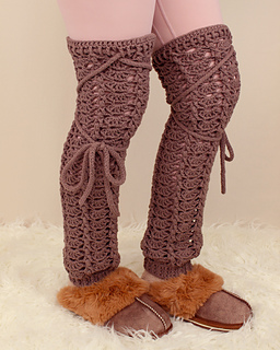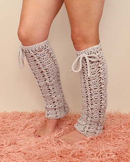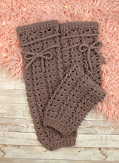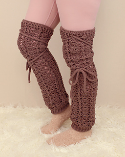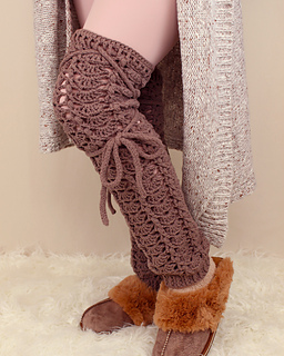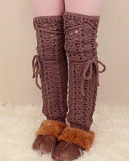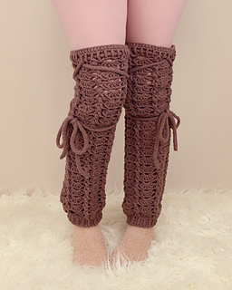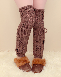 Examples use #4 worsted weight yarn. Approximately 750 yards of Lion Brand Feels Like Butta in Cocoa for over the knee example. Approximately 480 yards of Bernat Bundle Up in Dove for below the knee example.