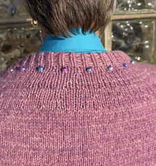 The beginning uses even increases around the circle to create a gentle slope from the neck to the upper chest, similar to a traditional circular yoke and then switches to mark the body and sleeve sections and begin the focused, diagonal increases of a raglan.