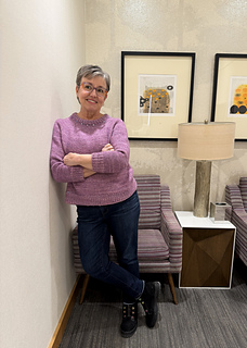 Sample 3, size 5, was knit in Lavender Lune Flocculent* Worsted (70% Pima cotton 30% Fine Merino, 218yds/100g chainette construction) in color way Ida Mae weighing 459 grams** using 1000 yards.