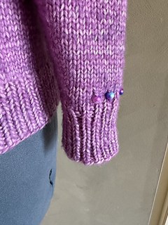 Sample 1, size 4 40” was knit in Lavender Lune Flocculent* Worsted (70% Pima cotton 30% Fine Merino, 218yds/100g chainette construction) in colorway Moonrise (lilac) and weighing** 435 grams using 948 yards/