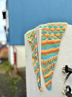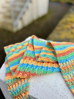 Choose four colors of fingering weight wool like West Wool Bicycle to knit this quick and colorful skinny scarf. There are lots of simple garter stitch striped sections for easy relaxing knitting. Follow the brioche section next or a simpler moss stitch option for a non-brioche version. As the fabric grows, enjoy slipped stitches and bubble stitches with playful pops of color. This small scarflet is a great travel project and it’s perfect for gift knitting!