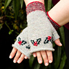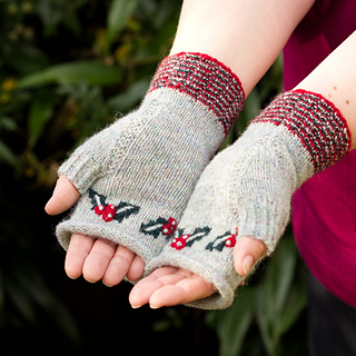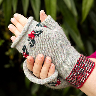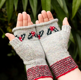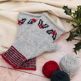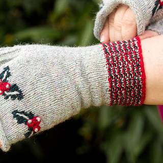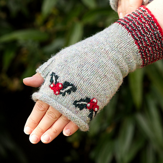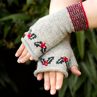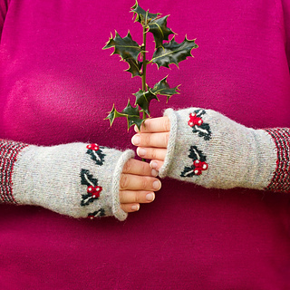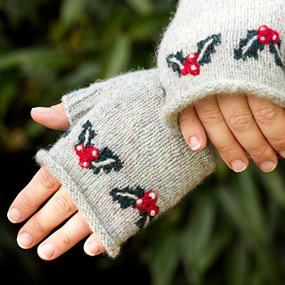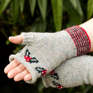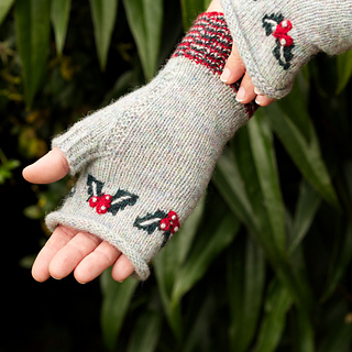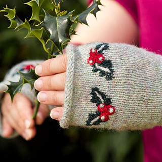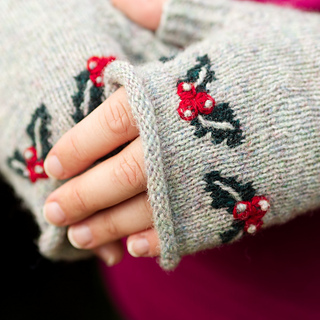 Add a bit of subtle winter cheer to your outfit with these fingerless mitts with their garland of winter holly. Ilex aquifolium is the latin name for Holly, which means sharp evergreen oak; most likely named for the similar shaped leaves to the oak tree. There are optional embroidery details for a more intricate finish.
