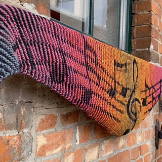 This narrow scarf is knitted using the illusion knitting technique and shows a clef and sheet music. The scarf measures approximately 204 cm x 38 cm.
