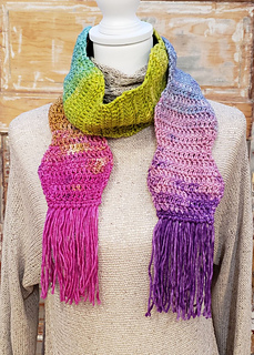 This scarf is a fun project to practice increasing and decreasing in double crochet rows. The hexagons formed by the changes in row length give a fun edge to the finished scarf. Add some fringe at each end and you have a playful accessory.
