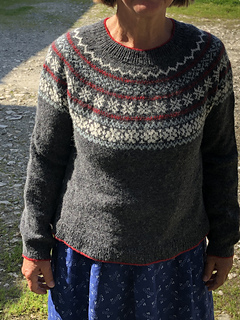 The colours in this sweater echo those found in traditional Finnish knitted items. These were often knitted using natural blacks and greys, with sparing use of red yarn, which was the most hard to come by and expensive. This yoked sweater is knitted from the top down using 100% Shetland wool, and German short rows have been used to raise the back neckline.