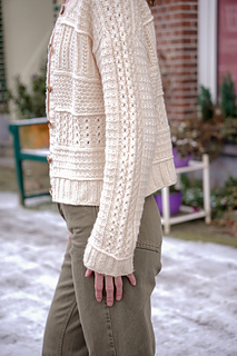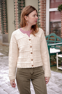 The cream cardigan sample was made during the test knit- after which the following adjustments were made: the lateral braid detail sits lower on the yoke, the neckline is less deep and the purl stitches were removed from the two textures on the center front.