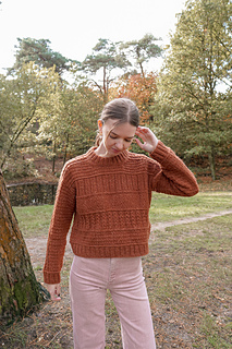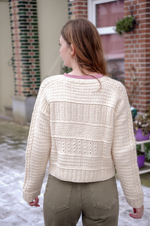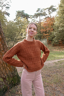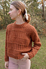 The front and back are then joined together to start working in the round. The sweater features 4 different textures that are mostly worked with knits & purls for a rhythmic knitting experience. Then, the hem is worked with 2x2 ribbing. Next, stitches are picked up for the sleeve which are worked in the round with the same mock cable stitch from the shoulders. Finally, a 2x2 folded ribbed neckline is added to the sweater.