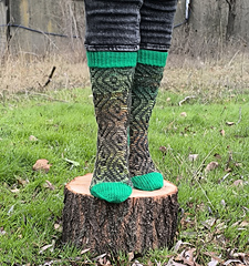 These charts are worked using slipped stitches. Unlike Fair Isle, there are no color changes during the round, no threads floating at the back of the work – or at the inside of the sock. Each round is worked completely in one color. At the end of each round, pick up the next color from underneath the color you just worked with to create a jogless striping (do not twist yarns).