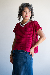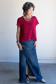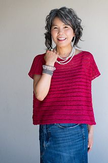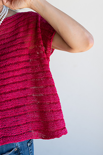 Inlet has a clean look and shows off the beauty of the yarn. This top only uses knit and purl stitches. To make an interesting texture without being complicated, some sections are worked with two strands of yarn held together, and some sections are worked with one strand of yarn.