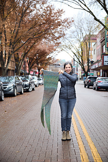 Into The Hoods Scarf (aka Scoodie) is worked from the top down. It starts with a rectangle that uses an i-cord cast-on and my signature Lola’s Pick Up Line technique. The body of the hood flows off of this base towards the neck. Once the hood is complete, your stitches split into two halves that are worked downwards with short rows filling in at the back of the neck. Decreases taper each side to a point, creating a long scarf with tails that are perfect for wrapping, draping, or tying around your neck however you like.