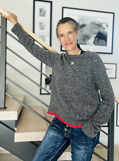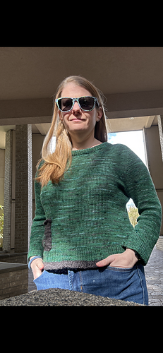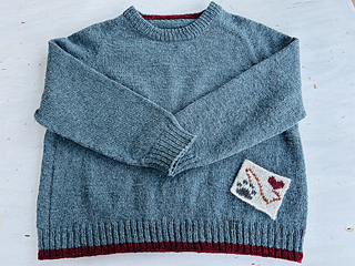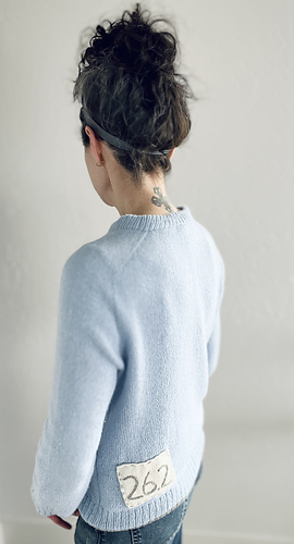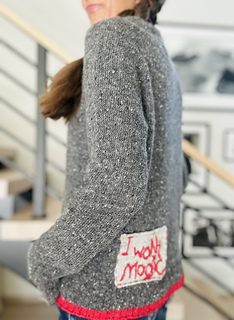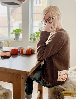 This pullover is worked seamlessly from the top down. The yoke is shaped by using a modified version of the contiguous set-in sleeves method developed by Susie Myers. Starting with the cast-on of the saddle shoulders and the back, the yoke is worked back and forth with increases for the front(s), the back and the saddle(s), respectively sleeves and neck shaping until the neck shaping is complete. From there, the yoke is worked in rounds to sleeve and body separation. At underarm, the sleeve stitches are placed on hold and the underarm stitches are cast on using your preferred method. Then the body is worked in rounds to the hem. The folded neck finishing is worked next. Sleeve stitches are then picked up again to work the sleeves top down in rounds to the cuffs. A patch (made out of a contrast colored swatch) is embroidered with a fun (magic) text and sewn on last (after blocking).