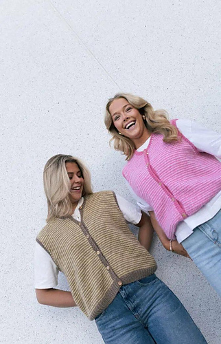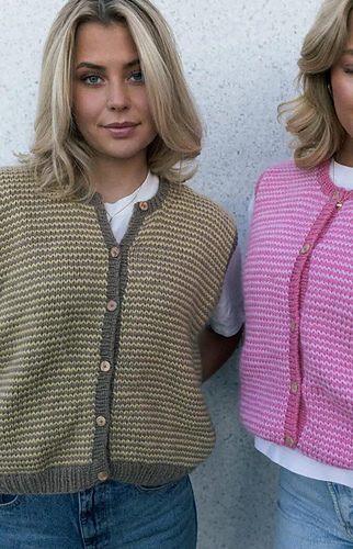 Pictured in Hip Wool in the colors “Pale yellow” and “Iced coffee”. Pink vest is “Candy pink” and “Pink kiss” (Model is 172 cm tall wearing size L).