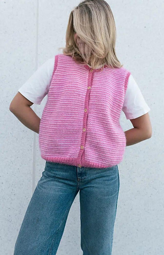 Knitting kit with yarn and free digital knitting pattern for a simple striped vest for women. The vest is in the same series as the Island sweater. Knit from the bottom up, back and forth in one thread Hip Wool. Simple narrow rib around the sleeves, neck and placket with nice details.