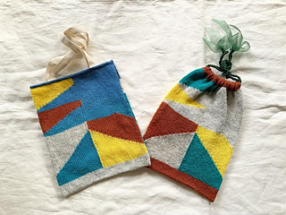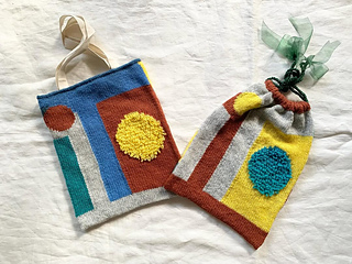 The tote bag is knitted to a size that matches a store-bought cotton tote bag (B5 size Muji Cotton My Bag, or similar). It finishes with an i-cord bind off on the top edge. After blocking, the cotton tote bag is sewn onto the inside of the bag to give it sturdy handles and a non-stretchy lining. The drawstring bag finishes with casings and cords.