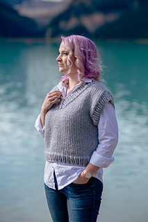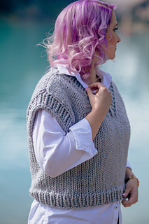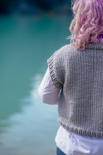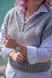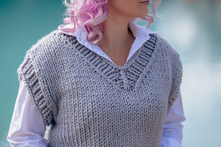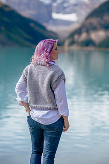 Knit bottom-up and in the round with a drop shoulder, the Ivy League Vest is intended to be worn with 6–8 inches (15–20.5 cm) of positive ease.